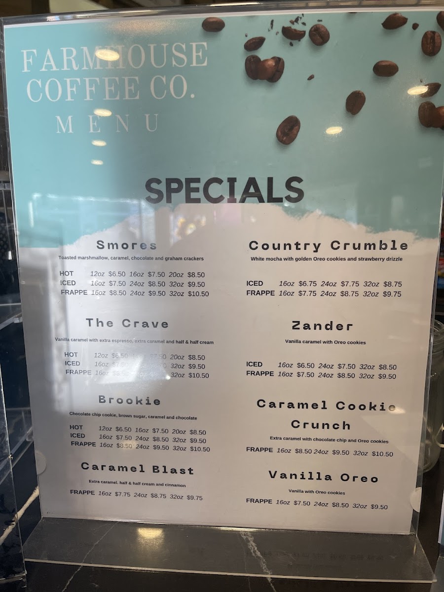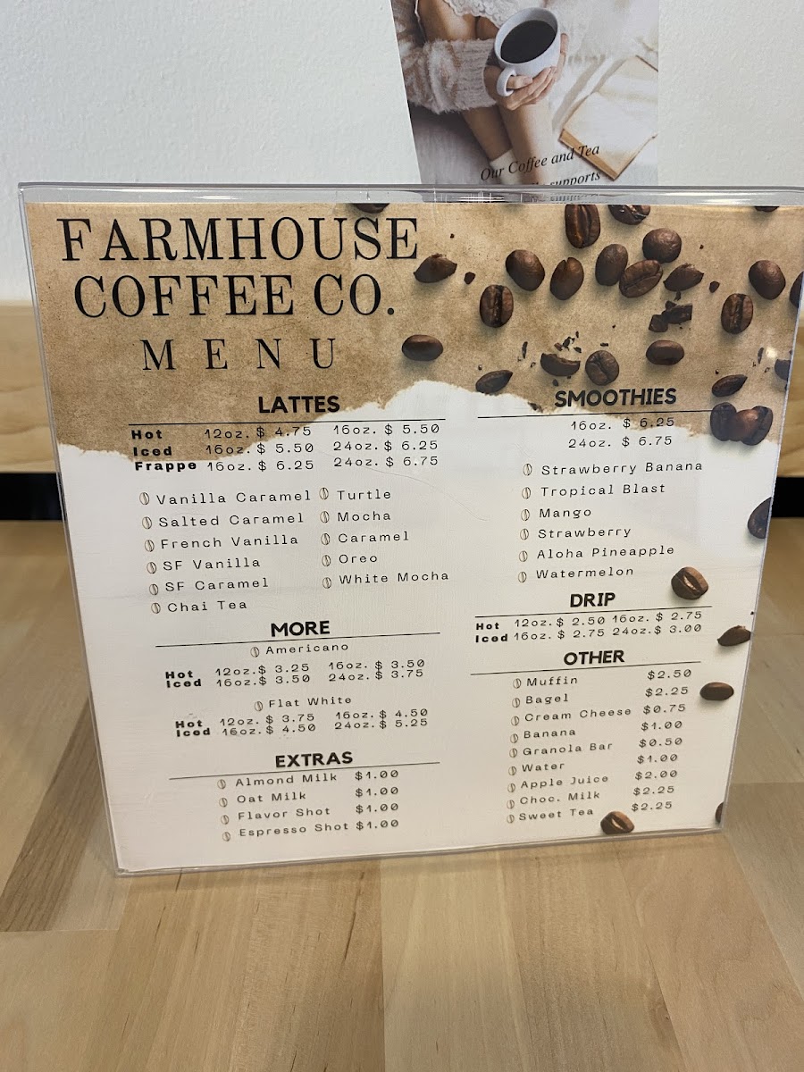 From a reviewer's perspective, the menu at Farmhouse Coffee Co. offers a delightful mix of classic coffeehouse favorites and playful specialty drinks. The Smores, available Hot, Iced, or as a Frappe, set a sweet, indulgent tone, while the variety of Lattes-including Sf Vanilla, Sf Caramel, Chai Tea Vanilla, Caramel, and Salted Caramel-showcases thoughtful flavor options, with extras like Almond Milk, Oat Milk, Flavor Shot, and Espresso Shot to customize each cup. For those seeking a lighter, fruit-forward option, the Smoothies-Strawberry Banana, Tropical Blast, Mango Strawberry, and Aloha Pineapple-provide a refreshing alternative. On the snack side, the menu includes simple yet satisfying choices like Muffin, Bagel with Cream Cheese, Banana, and Granola Bar, perfect for pairing with any beverage. Additionally, fans of dessert-inspired drinks will appreciate options such as Caramel Cookie Crunch and Vanilla Oreo, both offered Hot or Iced, rounding out a menu that is approachable, versatile, and full of flavor. Overall, Farmhouse Coffee Co. balances sweet treats, classic coffee options, and customizable drinks in a way that appeals to both casual visitors and dedicated coffee enthusiasts.